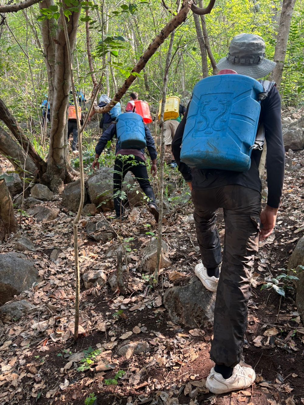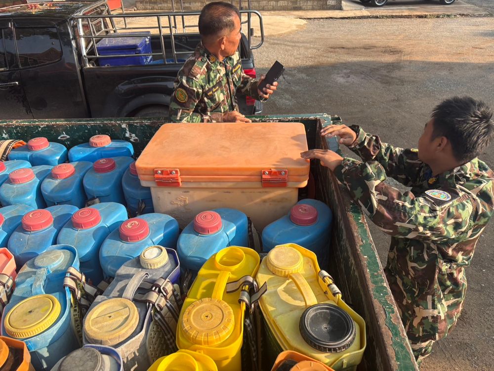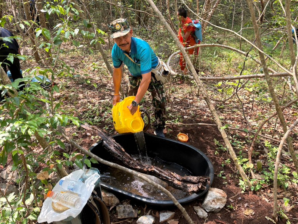 Boonchu mentioned that Lopburi has been running this project for over 10 years because they found animals had no water during the dry season. The limestone mountain geography cannot retain water; thus, when the dry season arrives, animals descend to forage below, leading them to be hunted or chased by dogs. "We create artificial water sources along the boundary using concrete rings and build two larger ponds. We refill the water for the animals on the mountain three times a year. When I heard Khao Yai wanted to do the same, I joined without hesitation. This time, we prepared 103 drums of 18-liter capacity to be filled and carried up the mountain."