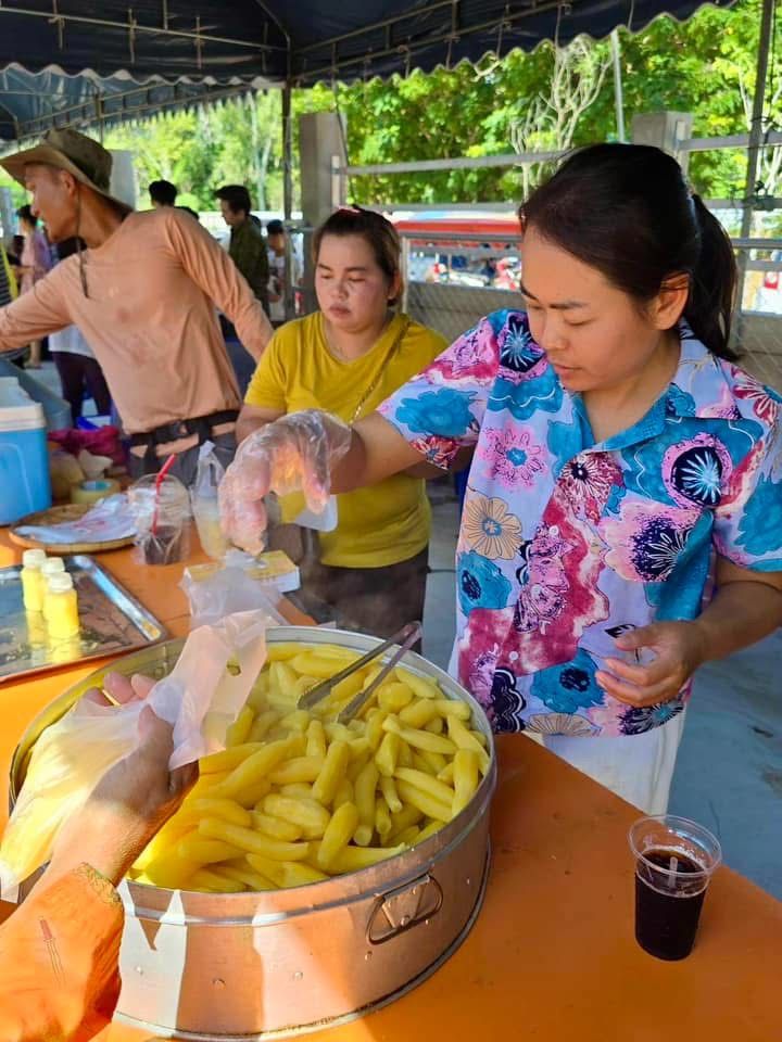 “We wanted more people to know about our garden, so we asked the district agricultural officer to sell at Market Village in Hua Hin with the network to launch ourselves. We took the small amount of produce we had—papaya, bananas, fresh vegetables—to sell once a month and at various events. Was the income a lot? Not really, and it was hard to sell. So, we had to adapt and process the produce into sweet potato chips and grain-topped baked bananas, focusing on ready-to-eat products,” Palm said of their efforts to promote the garden and start processing their goods.
