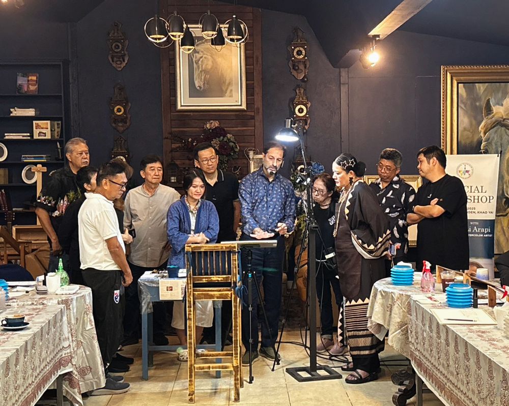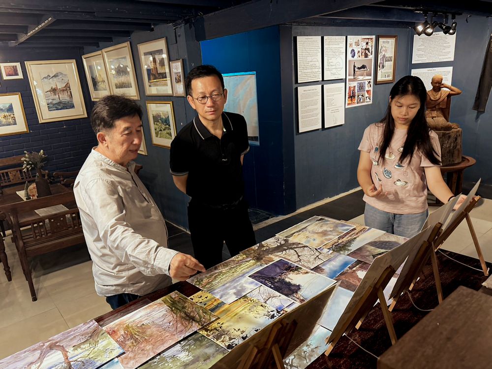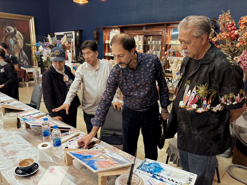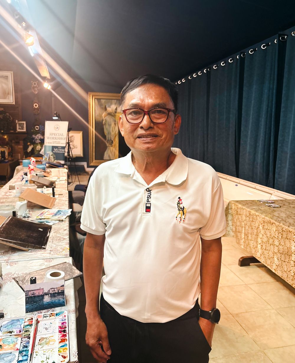 "Phisit Phuangmaliwan," 75, a retired civil servant from Nakhon Ratchasima Rajabhat University and one of the participants in this special workshop, shared that he came to the workshop as a companion for his daughter. His daughter, who is a dentist, loves to paint, and he also enjoys painting.