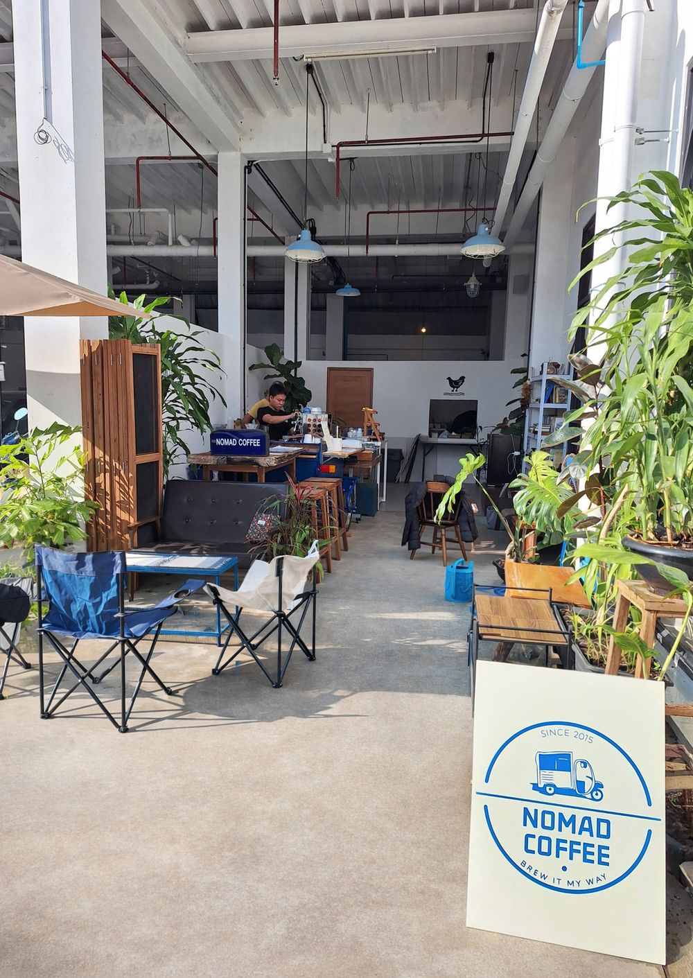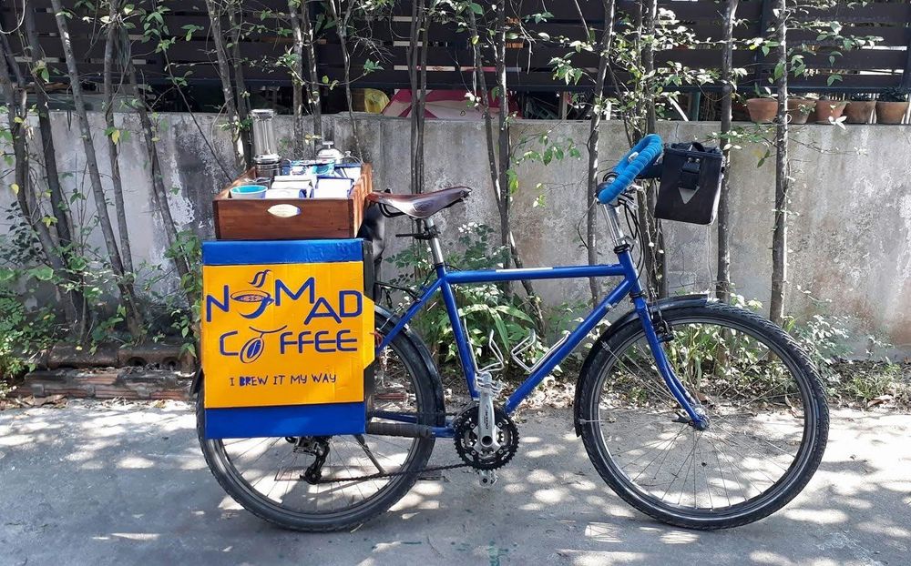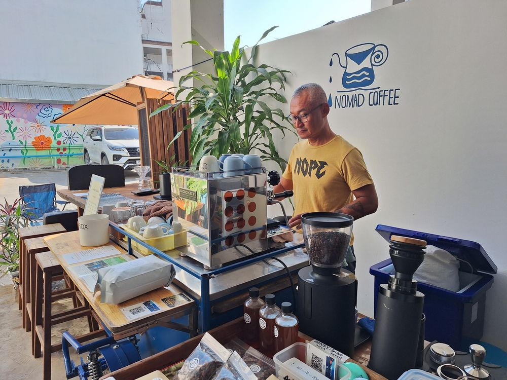 The air in Chiang Mai on a weekday morning in early February remains pleasantly cool. Tourists bustle through every nook and cranny of the Old City's streets. Today, we have an appointment with Sawang Thongdee at Nomad Coffee, his first permanent brick-and-mortar cafe. Although the shop is new, his journey with coffee is anything but; Sawang has been immersed in the world of coffee for a decade. Previously, he sold coffee at various festivals across Chiang Mai, starting with a self-designed bicycle sidecar and eventually moving up to a small food truck tricycle parked at Tha Pae Road three days a week. Now, he has settled down under the Darley Hotel, right next to a friend’s restaurant who invited him to share the space.