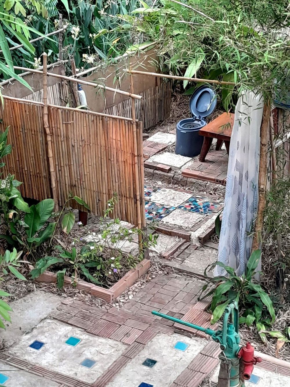 "Sustainable and eco-friendly living is something people talk about a lot, but whether they actually do it is another matter. Everyone's version of sustainability is different. But if you believe in yourself, others, and the environment surviving together, you have to do something. For me, I'm comfortable living like this: staying in the garden, sleeping in a tent, no electricity. I use solar cells and a power box to charge my phone, for lights, and a speaker for music. I use a pit latrine, but with a toilet seat over a hole dug about a meter deep. After use, I don't flush with water because that makes a mess; I use sawdust or rice husks to cover it, so there’s no smell. For water, I collect rain and canal water for bathing. I'm learning to grow vegetables and make organic compost using coffee husks, grounds, food scraps, rain tree leaves, cow manure, and straw. That's the gist of it. I also raise ducks and chickens for eggs and meat, and sell the surplus."