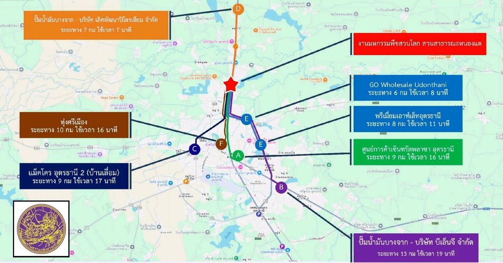 As for mass transit, we have prepared 7 shuttle bus dispatch points or special additional vehicles. Point 1 is at Central Udon Thani and UD Town, which is in the city center, a tourism and shopping hub. From this point to the expo area is about 9 kilometers, taking about 16 minutes. Point 2 will be at the Bangchak gas station on Mittraphap Road, outbound from Nong Khai, about 7 kilometers away, taking 7 minutes. This area can park many large vehicles. Point 3 is also at a Bangchak gas station, located southeast of the city on the route from Sakon Nakhon Province, about 13 kilometers away. One can use the ring road or eastern bypass to connect to the Horticultural Expo as well, taking about 19 minutes. Additionally, if coming from Nong Bua Lamphu and Loei, one can stop at Makro Udon Thani Branch 2. For those coming from the east, parking is available at 2 more points: Go Wholesale, taking about 8 minutes for roughly 6 kilometers, and Premium Outlet Udon Thani, about 8 kilometers away taking 11 minutes. Another point in the city is "Thung Si Mueang," which has a spacious area capable of accommodating much parking, taking about 16 minutes to reach the venue. It can be seen that all points are privately owned, all of which are ready to support the event.