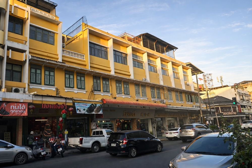 ออกจากตรอกสำราญจิตต์ กลับมาที่ถนนจอมพล เดินไปอีกหน่อยจะเห็นอาคารสีเหลืองเป็นแนวยาวโดดเด่นด้วยสถาปัตยกรรมสมัย ร.6 เช่นกัน ต่อมาได้รับการประกาศให้เป็นอาคารควรค่าแก่การอนุรักษ์ปี 2561 จากสมาคมสถาปนิกสยาม ในพระบรมราชูปถัมภ์ เป็นอาคารติดกัน 3 หลังได้แก่ มีจงมี แสงฟ้า และจี่อันตึ้ง